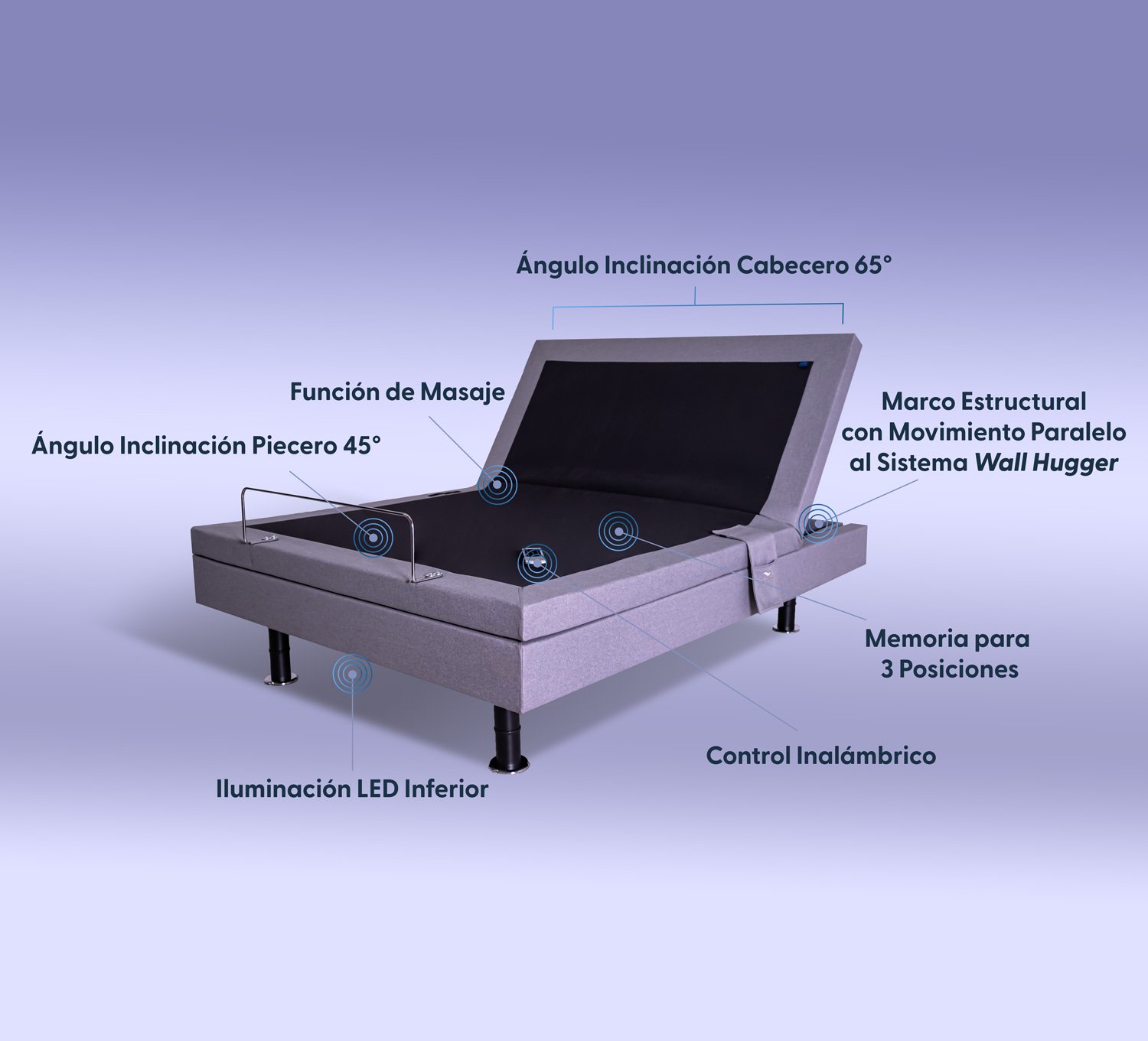 La cama ajustable Elite redefine tu forma de descansar con una experiencia ergonómica y personalizada. Equipada con tecnología Bluetooth, control remoto táctil, función de masaje programable y sistema Wall Hugger, se adapta a tu cuerpo y a tu estilo de vida. Incluye luz LED inferior para mayor visibilidad nocturna, patas de doble altura ajustable y un práctico bolsillo lateral para el control. Con certificación ECO Estándar (Alemania), es la combinación perfecta entre innovación, diseño y bienestar.